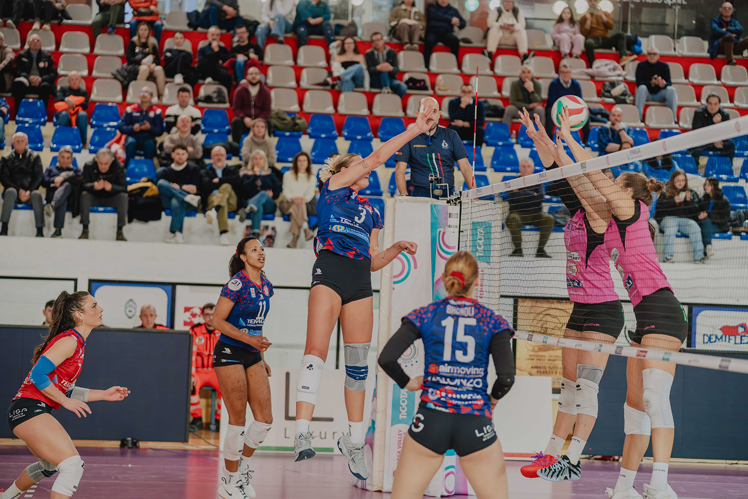 Quarto set. Polesello in fast apre la frazione, Trampus morbida fa 2-0, la pipe a rete di Ravarini fa 3-0. Costagli in diagonale trova il primo punto rosa, 1-3. Costagli piazza il suo attacco e fa 3-6, arriva poi l’ace della capitana rosa, 4-6. Il muro di Marchesini su Vazquez fa 8-4 e coach Cuello deve chiamare time out. Si torna in campo e la palla out delle padrone di casa regala i 5-8 a Casalmaggiore. Bella e potente la fast in diagonale di Dumancic, palla al centro del campo e 7-10, arriva poi l’ace di Vazquez su Trampus, 8-10. Altino si porta sul 12-8 e coach Cuello chiama time out. Dumancic mette a terra il pallone del 9-13. Sul 18-10 entra Rastelli per Ravarini mettendo a referto la sua prima presenza ufficiale. Botta a tutto braccio per Vazquez, 12-20, il murone di Nwokoye poi accorcia nuovamente, 13-20. Ndoye prova a passare ma Nwokoye piazza il muro, 14-21. Farelli manda out la sua battuta, 15-23, ma Siakretava trova la palla set 24-15 e chiude con un ace 25-15.