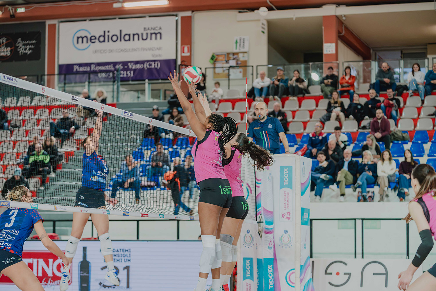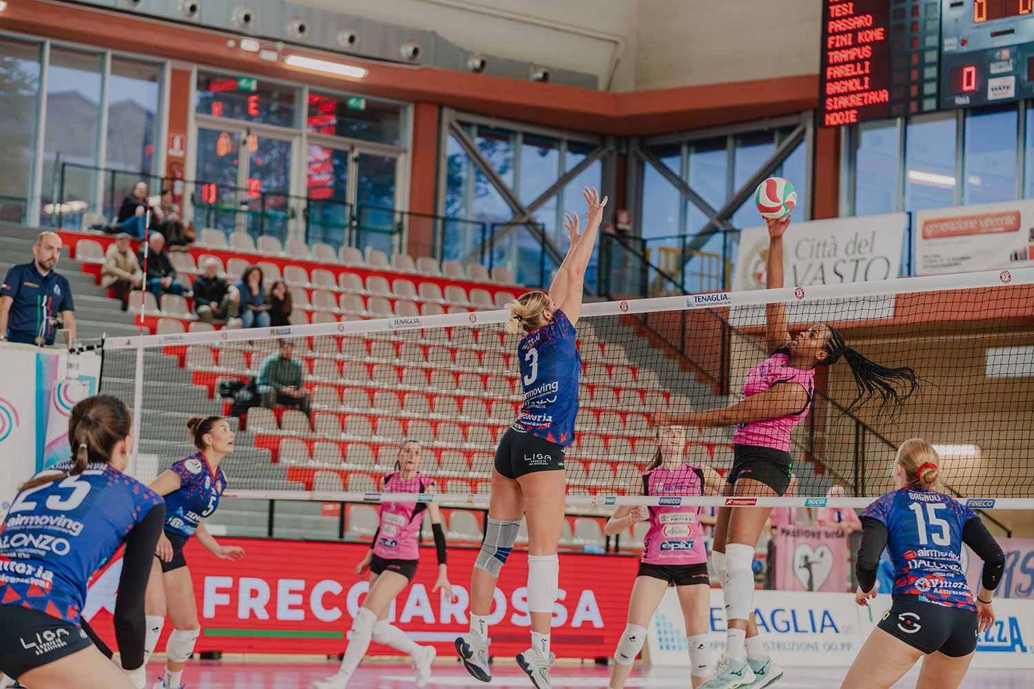 Secondo set. L’attacco di Nwokoye trova il tocco del muro e apre la seconda frazione, 1-0, il muro di Polesello su Costagli pareggia i conti, 1-1. Ndoye tenta l’attacco ma Nwokoye piazza il monster block, 2-1, Marchesini poi manda out, 3-1. Arriva anche l’ace di Costagli sulla riga di fondo, 4-1, poi la capitana rosa si ripete nello stesso modo, 5-1, time out Altino. Si torna in campo e il muro di Vazquez-Nwokoye ferma l’attacco di Siakretava, 6-1. Gran botta di Vazquez, diagonale stretta e 7-2, l’invasione fischiata a Siakretava porta Casalmaggiore sull’8-2. Dumancic porta le sue sull’11-6. Velenoso tocco di seconda di Pasquino che spiazza la squadra di casa, 12-7, il muro di Ravarini su Ndoye allunga nuovamente, 13-7. Le abruzzesi fanno 10-14, coach Cuello preferisce chiamare time out. Ravarini ferma l’inerzia delle rosso blu, piazzata e 15-12. Vazuez mette a terra il suo smash, 17-13, time out Altino. Vazquez tira la botta su Ndoye e fa 18-14. Costagli smasha sulle mani del muro e trova il 19-15. Nwokoye sfrutta la cattiva ricezione di Tesi e sigla il 22-16. Tutto braccio per Ravarini, Siakretava ci prova ma non contiene, 23-17, arriva poi l’ace di Costagli, 24-17, set point. Trampus manda fuori e chiude 25-17 come il primo set.