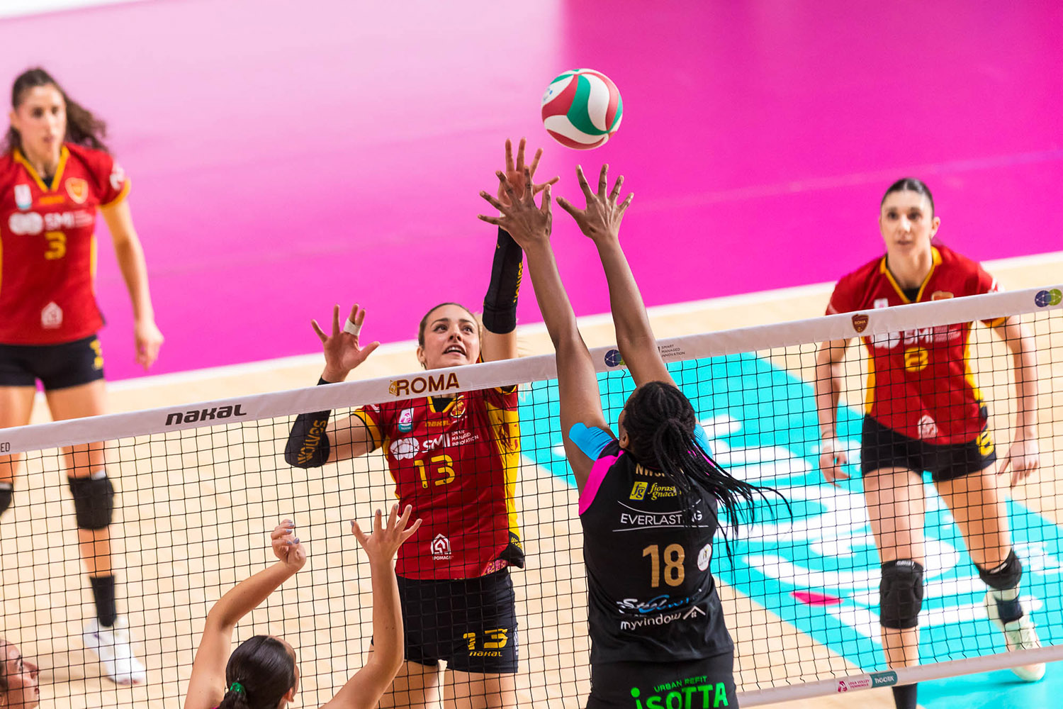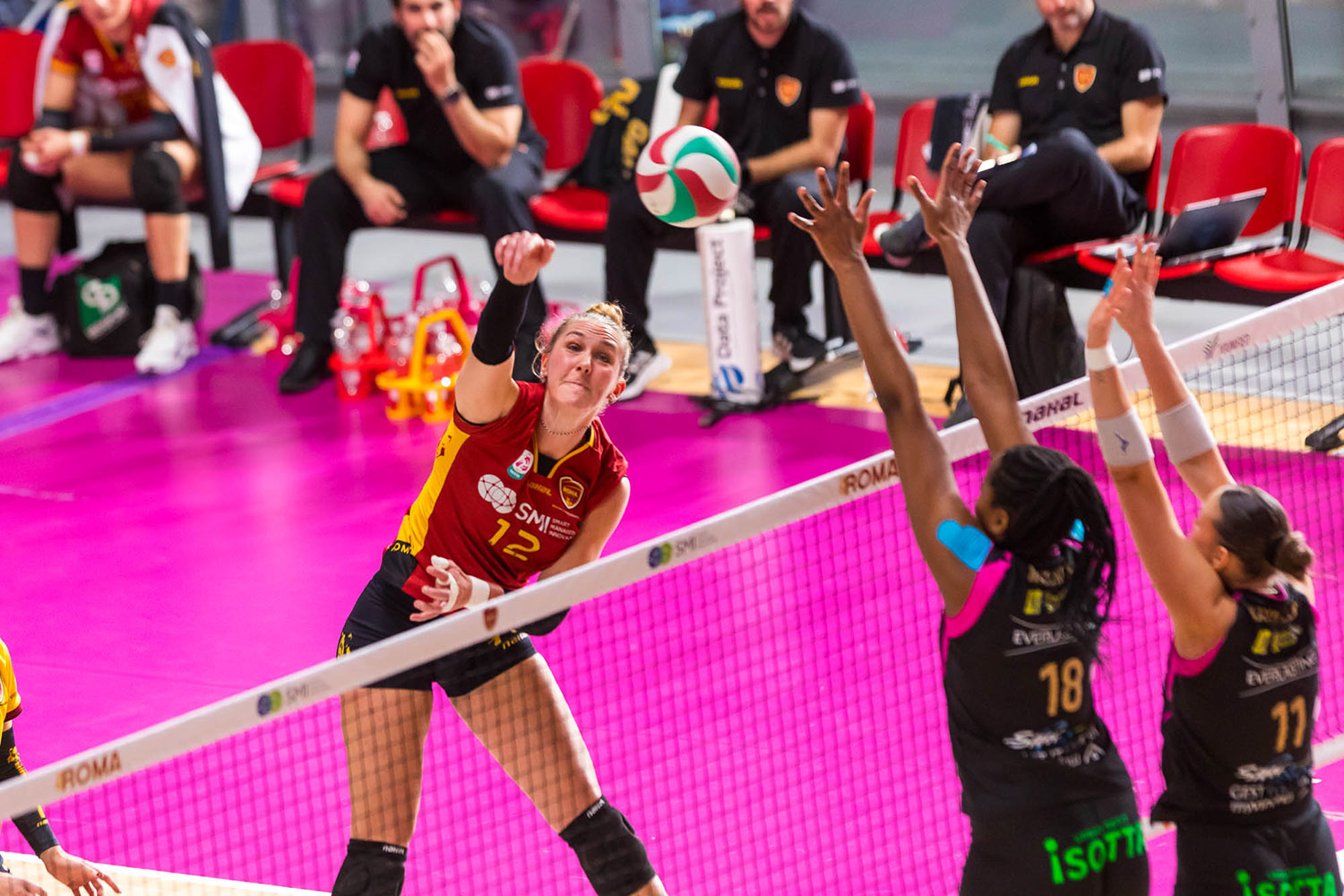 Primo set. Guidi prova la fast ma il muro di Costagli apre il match, Angelina pareggia i conti, 1-1, Guiducci manda a rete a sua battuta e rimanda le rosa avanti 2-1, Perovic fa 2-2. Capitan Costagli trova il mani out del 3-4. Bella diagonale di Kavalenka, 4-5, l’errore di Mason in attacco pareggia i conti 5-5. Tocco morbido di Ravarini che trova il 6-6. Bel primo tempo di Nwokoye che trova ferma la difesa, 7-9, la centrale poi si ripete, 8-9. Roma si porta sull’11-8, coach Cuello chiama il primo time out di gara. Si torna in campo e l’errore di Angelina fa 9-11. Kavalenka spara il suo tentativo e trova il -4, 10-14. Il mani out di Costagli è vincente, 11-15, Mason poi manda out il suo tentativo, 12-15. Roma fa 17-12, altro time out per coach Cuello. Melissa Marku trova il 13-21. Marku sigla il primo ace dell’incontro, 15-22, il murone di Nwokoye accorcia, 16-22. L’attacco di Kavalenka è vincente, 17-23, il murone ancora di Nwokoye accorcia nuovamente, 18-23. Il muro di Ravarini chiude il break, 19-23, time out per coach Cuccarini. Si torna in campo e la diagonale di Ravarini è un missilie, Zannoni non può nulla, 20-23. Perovic trova la palla del set 24-20, Nwokoye annulla la prima palla set, 21-24. Perovic chiude 25-21. Top scorer: Perovic 9, Nwokoye 5