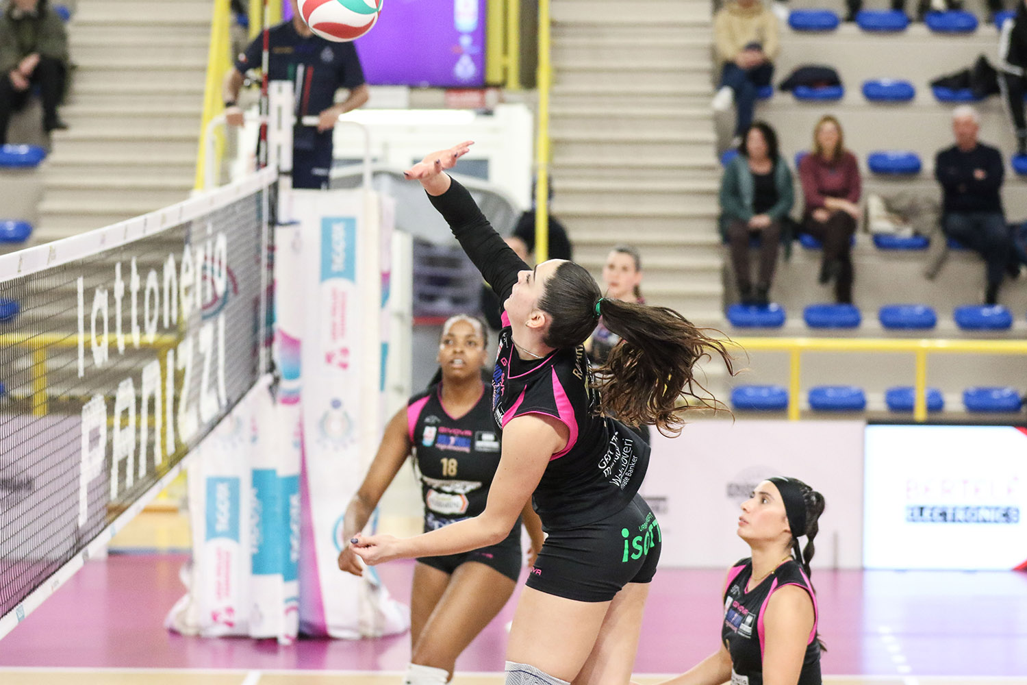 Secondo set. Bellia apre la seconda frazione, Pasquino pareggia i conti subito 1-1, Ravazzolo riporta avanti le sue e ancora Bellia fa 3-1. Si lotta punto a punto, infrazione a rete fischiata alle ospiti, 5-6, l’errore di Zago poi pareggia i conti 6-6. Coach Cuello chiama time out, al ritorno in campo è Costagli a mettere a terra il pallone, 8-10, e poi la stessa capitana rosa, con un tocco a muro, accorcia nuovamente 9-10. Monster block di Nwokoye su Bellia, parità 11-11, il sorpasso delle rosa poi è frutto di un altro murone stavolta di Costagli, 12-11 e l’errore in costruzione di Turco chiude il break, 13-11. Ravarini trova il tocco del muro e fa 15-13 e la stessa opposta sfrutta ancora il muro ospite trovando il 16-13. Grande primo tempo di Dumancic che mette il pallone sulla riga del campo, 17-15, Vazquez allunga, 18-15, time out per coach Barbieri. Il tentativo di Nardelli non passa dal muro di Pasquino, 21-17. Passa l’attacco di capitan Costagli, 23-19, Ravarini con un mani out trova la palla del set, 24-19. Il murone di Costagli su Zago chiude 25-19. Top scorer: Costagli 6, Zago 5